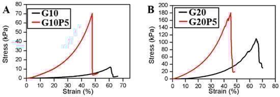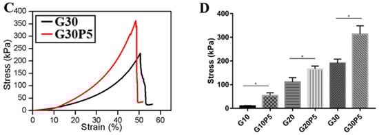 As shown in Figure 6A–C, the GelMA/PEGDA hydrogel had higher compressive stress than that of pure GelMA hydrogel. The stress of G10P5 was 70.6 kPa, which was almost 6 times G10 (12.1 kPa). The strain of G10P5 was 47.9% less than G10 (60.8%). The PEGDA significantly (p < 0.05) increased the compressive stress compared with the hydrogel without PEGDA, as shown in Figure 6D. These results were attributed to the high degree of crosslinking interaction between GelMA and PEGDA network. The results were also proved by the SEM image mentioned before; the high stress GelMA/PEGDA hydrogel had thicker walls. However, the higher concentration of GelMA and GelMA/PEGDA led to higher crosslinking density, which increased the hydrogel stiffness and became more fragile.