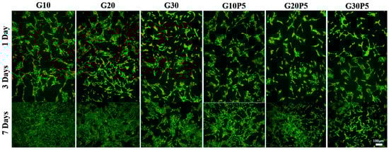 Live/dead cell staining method was used to investigate the cell viability of MC3T3-E1 cultured on the surface of GelMA and GelMA/PEGDA hydrogel for 1, 3, and 7 days. As shown in Figure 7, almost all of the cells were alive after 1, 3, and 7 days culture for all the samples; the viability was greater than 99% analyzed by Image J software. The images manifested that the photo-crosslinking treatment of hydrogel was nontoxicity to cells. The hydrogel with PEGDA showed no difference from the pure GelMA hydrogel, suggesting the PEGDA did have a toxic effect on cell viability. The GelMA/PEGDA hydrogel showed good biocompatibility and could be used for cell encapsulation.
