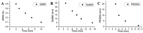 (A) The impact of I2959 concentration on gelation time, when concentration of GelMA was 10% w/v; (B) the impact of GelMA concentration on gelation time, when concentration of I2959 was 0.1% w/v; (C) the impact of PEGDA concentration on gelatin time, when concentation of I2959 was 0.1% and GelMA was 10% w/v.