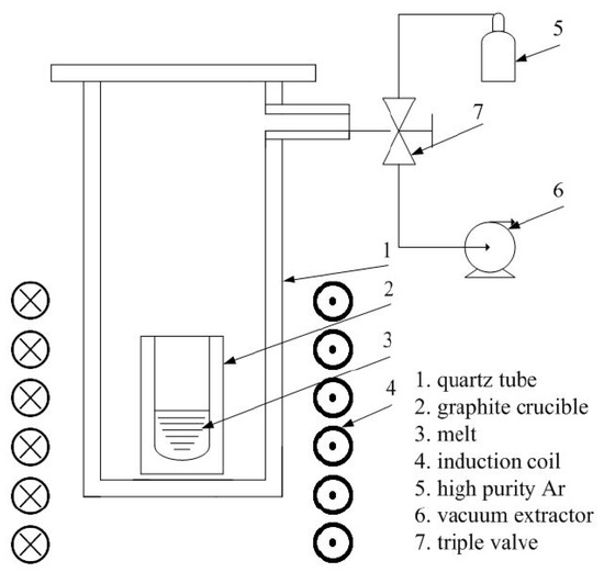 In total, 48 ternary Mg-Zn-Gd samples were prepared (with up to 2 at.% Gd, 10 at.% Zn, 0.25~60 Zn/Gd atomic ratio). The sample compositions are shown in Table 1, together with analytical methods. All of the samples were produced from high purity Mg (99.9 wt %), Zn (99.99 wt %), and Gd (99.99 wt %) by high-frequency induction melting in the graphite crucible and then casting into a steel mold under an argon atmosphere. Typical weight of these samples was 50 g. In order to prevent the vaporization of Mg and Zn, the graphite crucibles containing the weighted raw materials were sealed into quartz tubes under a rarified argon atmosphere. The sketch map of the melting device was shown in Figure 1.