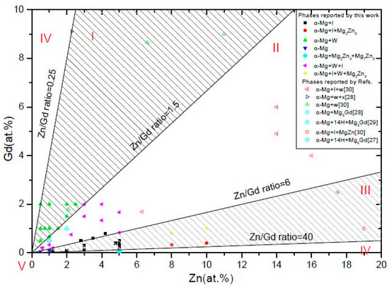 - Five regions can be classified in this Mg-rich section: (I)α-Mg+W-phase(+binary compounds), (II)α-Mg+W-phase+I-phase(+binary compounds), (III)α-Mg+I-phase (+binary compounds), (IV)α-Mg+binary compounds, and (V)α-Mg. This diagram of phase constitution would give a guideline for the design of Mg-Zn-Gd alloys to match the expecting properties by obtaining the desired phase components.