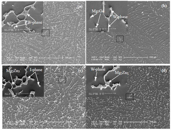 Second electronic image (SEI) of Mg-Zn-Gd alloys (Zn/Gd ratio, sample No.): (a) Mg-1Zn-2Gd (0.5, Sample 35), (b) Mg-1Zn-0.333Gd (3, Sample 39), (c) Mg-5Zn-0.278Gd (18, Sample 10), and (d) Mg-5Zn-0.083Gd (60, Sample 14).