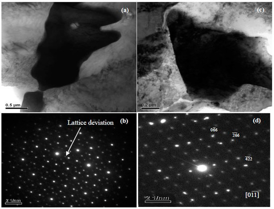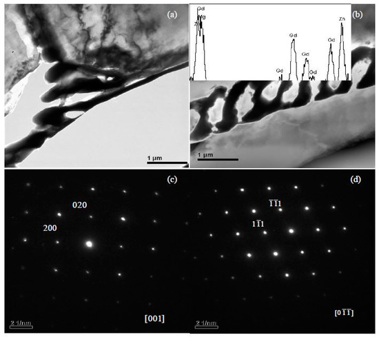 Phases in special alloys were further characterized by TEM. For Mg-5Zn-0.278Gd alloy (Sample 10, Zn/Gd = 18, represented for region (III)), the dendritic phase is identified as I-phase (Figure 4a). A slight lattice deviation from the ideal icosaheral symmetric positions is pointed out with the white arrow in the corresponding selected area electron diffraction (SAED) patterns (Figure 4b), owing to linear phason strains coming from its anisotropic growth during solidification [36]. Through the analysis of EDS, a composition of Mg30±1Zn62Gd8±1 (at.%) is adopted for I-phase. One another phase with triangular shape has also been observed (Figure 4c) and identified as W′-phase by SAED patterns (Figure 4d). It has a composition of approximate Mg94±1Zn5.47±0.5Gd0.53±0.1 (at.%) and a face centered cubic (fcc) structure with a lattice parameter of a = 2.3529 nm. The lattice parameter of the W′-phase is triple as one of W-phase [13]. There is a cube-to-cube orientation relationship existing between W-phase and W′-phase, as (//, //, //), which has been reported in our previous work [13] and by Luo [37]. W′-phase is usually considered as 2/1 crystalline approximate to I-phase. For Mg-1Zn-0.333Gd alloy (Sample 39, Zn/Gd = 3, for region (II)), the skeleton morphology phase is W-phase (Figure 5a). The corresponding SAED patterns along [001], [111] and [112] zone axes are shown in Figure 5b–d, respectively. The W-phase has a composition of approximate Mg31Zn45Gd24 (Zn/Gd = 1.9, at.%) and it is identified to have a face centered cubic (fcc) structure with a lattice parameter of a = 0.6927 nm. The lattice parameter of W-phase in Mg-1Zn-0.333Gd alloy (a = 0.6927 nm) is slightly larger than that in Mg-Zn-Y system (a = 0.6848 nm) [37]. Meanwhile, I-phase with particle shape is founded (Figure 6). By the extrapolation technique described by Lorimer et al. [38], a composition of Mg27.5±3.5Zn63.5±1.5Gd10±3 (at.%) is adopted to I-phase. For the Mg-1Zn-1Gd alloy (Sample 36, Zn/Gd = 1, represented for region (I)), two kinds of W-phase with dendritic or twist-like shape have been identified in Figure 7a,b. Its corresponding SAED patterns along [001] and zone axes are shown in Figure 7c,d, respectively. The W-phase in Figure 7b has a composition of Mg36.4Zn35.76Gd27.84 (Zn/Gd = 1.3, at.%) with a lattice parameter of a = 0.7256 nm. For W-phase with the cubic structure (Figure 5 and Figure 7), a lower Zn/Gd ratio would result in a larger lattice parameter. W-phase has the similar face-centered cubic structure to Mg3Gd (, a = 0.700 nm), and once been considered as Mg3Gd [39].