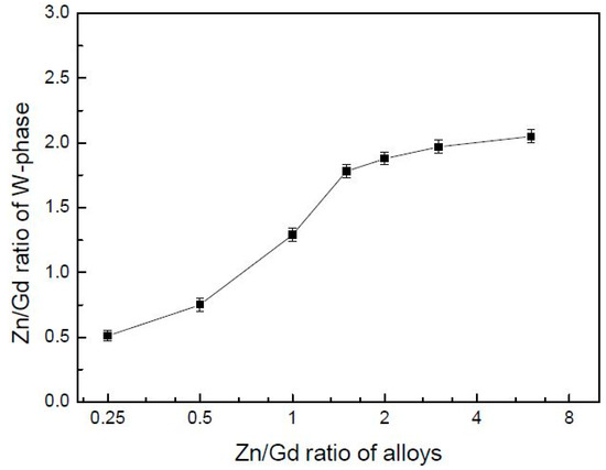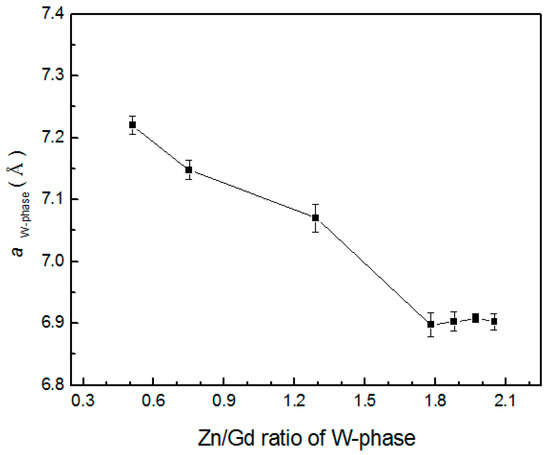 When Zn/Gd ratio of the alloys is between 0.25~6, the W-phase would form, but be of a different composition and with a changed lattice parameter. The Zn/Gd ratio in W-phase is ascribed with the one in alloy (Figure 8), which indicates that extra solute has occurred by the substitute or interstitial mode when W-phase precipitating. The cubic lattice parameter of W-phase could be deduced with the Bragg’s law for the cubic crystal lattice [41]: