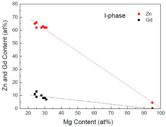 Contents of Zn and Gd of I-phases (Zn/Gd = 6:1) in Mg-1Zn-0.333Gd alloy (Sample 39) plotted as a function of the Mg content by EDS with TEM.