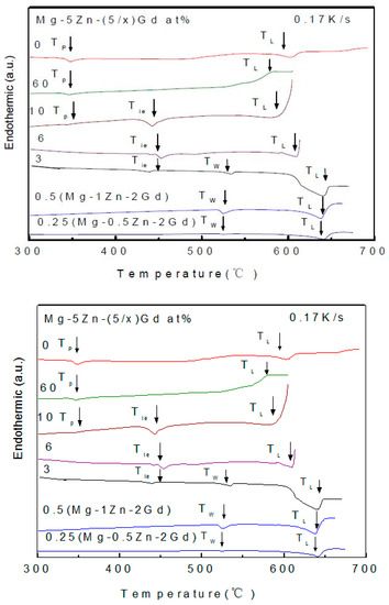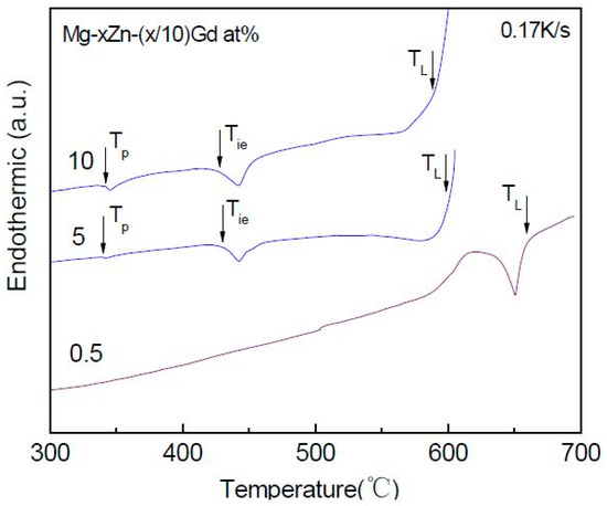 Figure 13 shows the heat trace of alloys with different alloying element content with Zn/Gd = 10 (Sample 1, 7, 48,). Mg-0.5Zn-0.05Gd alloy (Sample 48) only shows one endothermic peak at 655 °C corresponding to TL. For Mg-5Zn-0.5Gd (Sample 7) alloy and Mg-10Zn-1Gd (Sample 1) alloy two more endothermic peaks are identified, corresponding to Tp (Mg7Zn3) and Tis, respectively. The endothermic peaks for Mg-10Zn-1Gd alloy are wider than the ones for the Mg-5Zn-0.5Gd alloy. TL (595 °C) of the former one is higher than TL (567 °C) of the later one. It could be seen in Figure 13 that TL decreases as the alloying element content increasing. The same phenomenon could also been found in the alloys with Zn/Gd = 5 in Table 5.