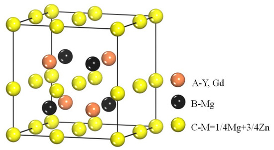 The W-phase with fcc structure in Mg-Zn-Gd system can be formed in the Zn/Gd ratio range of 0.25–6. This kind of W-phase was firstly determined by E. M. Padezhnova et al. [28] by X-ray diffraction in the Mg-Zn-Y system. It possesses a partially ordered AlMgCu2-type fcc structure: a = 0.6848 nm and its space group is [37]. The crystal structure of the W-phase in the Mg-Zn-Y system was shown in Figure 14. It can be found that four Y atoms occupy the 4A positions, four Mg atoms occupy the 4B positions, and eight (Mg+Zn) atoms, with the ratio of 1:3, occupy the 8C positions. When Gd atom instead of Y atom, the W-phase exhibits a larger lattice value due to the larger atomic size (rGd = 0.181 nm, rY = 0.178 nm). Meanwhile, the lattice parameter a of the W-phase is very sensitive to the composition of Mg-Zn-Gd alloys, especially when affected by the Zn/Gd ratio of alloys. The Gd solution would induce the lattice expansion. W-phase would transform into another compound under certain condition by the diffusion and rearrangement. This has been verified by its disappearance and transformation to the 14H phase during the heat-treatment at 773 K, as reported by M. Yamasaki [26]. The similar phenomenon occurred in the Mg-Zn-Y system [23,28]. The X-phase with 18R-type structure, in as-cast Mg-Zn-RE-Zr alloy with low content of Zn and high content of RE, transformed into the 14H LPSO structure through certain heat treatment procedure [47]. In addition, the occurrence of W-phase in Mg-Zn-Gd alloy indirectly reveals that W-phase would transform under some condition.