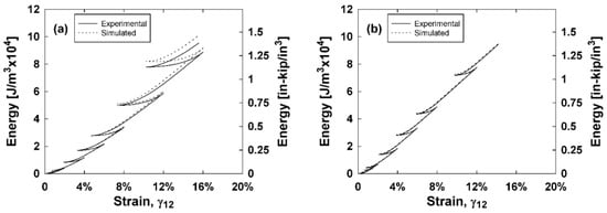 To investigate the ability for the constitutive model to predict the composite hysteresis behavior and energy dissipation, a MATLAB® code was generated to simulate the shear stress versus shear strain curves. These simulated curves are integrated to obtain the energy dissipated of each composite. Inputs of the MATLAB® code include the experimental shear strains and the damage parameters for each composite type. The sign of the change in strain for each step, as well as the maximum strain reached up to the current step of the simulation determined whether the current step was loading, unloading, or reloading. A positive change in strain and a strain that exceeds the current maximum strain indicates a shear stress that follows the stress–strain backbone curve. Damage parameters are calculated using Equations (7) and (8) and the shear stress is found using Equation (4). A strain that is less than the current maximum strain and a negative change in strain indicates that there is unloading. One can assume that the unloading curve is symmetric to the backbone curve. To simulate this, the total strain is zeroed at the start of unloading. Then, the subsequent changes in strains are halved and added to the initially zeroed strain. Damage parameters are calculated using Equations (7) and (8) and the calculated stresses found using Equation (4) are doubled and subsequently subtracted from the final stress on the backbone curve before unloading. By halving and doubling the strains and stresses, respectively, this unloading curve is symmetric. Lastly, a strain that is less than the current maximum strain and a positive change in strain indicates that there is reloading. The reloading portion is calculated similarly to the unloading portion, except the doubled stresses are subsequently added to the last stress obtained during unloading. It is reasonable to assume that the unloading and reloading portions are not perfectly symmetric. Instead of doubling the calculated stresses, a symmetry factor between 1.75 and 2 is used to multiply the stress by to find a good fit for the unloading portions of the curves. These values are 1.8, 1.8, 2, and 1.75 for the E-glass, E-glass hybrid, S-glass, and S-glass hybrid composites, respectively. This MATLAB® code was implemented for each composite type and the results are compared with experimental stress–strain curves in Figure 9. Both the experimental and simulated curves are integrated to find the energy dissipated and these results are plotted against the shear strain in Figure 10.