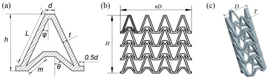 In this study, an NPR structure was used as the structural unit of the stent, which made the stent have NPR effect in radial and longitudinal direction. The Autodesk Computer Aided Design (AutoCAD) was used to draw arrowhead structure unit as shown in Figure 1a. The arrowhead structure unit was repeated along the axis and circumferential directions to form the three-dimensional model of the vascular stent. The flat developing drawing of the stent is shown in Figure 1b and the three-dimensional model of the stent is shown in Figure 1c.