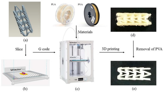 3D printing process of PLA vascular stent, (a) The three-dimensional model of vascular stent; (b) The Cura software interface; (c) The PLA, PVA filaments and Ultimaker 3 Extended 3D printer; (d) The PLA vascular stent with PVA support material; (e) The PLA vascular stent removed PVA material.