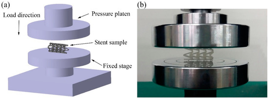 The compression experiment was tested by a UTM6104 microcomputer-controlled electronic universal testing machine (Shenzhen Suns Technology Stock Co., Ltd., Shenzhen, China). As shown in Figure 4, the PLA vascular stent was placed horizontally on the stage and the pressure platen was compressed at the speed of 1 mm/min until the stent was crushed. The compressive force was applied following the radial direction of the stent, which was perpendicular to the axis of the stent. The radial force versus platen displacement was measured during the compression process. In order to facilitate the comparison of different lengths and geometric parameters of stents, the radial force was divided by the total length of the stent for normalization. The radial force of the stent (per unit length) F (N/mm) was measured as a function of radial displacement Dis (mm) [31].