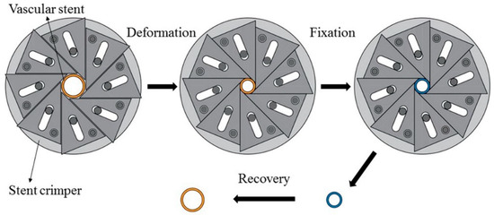 Before the experiment, the initial diameter DO and the initial length HO of PLA stent were measured. The experimental process mainly included three parts as shown in Figure 5. The first part was the deformation of the PLA stent, in which a crimped shape was created. Water in the constant-temperature numerical control water-bath box was heated to the deformation temperature of 65 °C. The PLA stent was placed in a water-bath box for 5 min and was then crimped by using a self-made crimping device. The diameter of PLA stent was decreased gradually and the crimping process was stopped until the circumferential structure units were deformed and close to each other. The second part was the fixation of the deformed PLA stent. The PLA stent and crimping device was removed from the water-bath box maintained the crimped shape and cooled down to room temperature. The PLA stent was taken out of the crimping device after completely cooled and fixed. The crimped diameter DC and crimped length HC of PLA stent were measured. The third part was the recovery of the PLA stent, in which the original shape of the PLA stent was restored. The water temperature in the constant-temperature numerical control water-bath box was set to the recovery temperature of 65 °C, and the crimped PLA stent was then placed in the water-bath box until the shape didn’t change. The recovery diameter Dr and the recovery length Hr of PLA stent were measured. According to Formulas (2) and (3), the diameter recovery ratio and length recovery ratio of 3D-printed PLA stent were calculated.