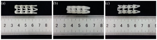 The shape change of numbered B1 3D-printed PLA vascular stent in SME experiment is shown in Figure 6. Figure 6a shows the original shape of the PLA stent before experiment and b shows the PLA stent after deformed under deformation temperature and fixed under room temperature. Figure 6c shows the PLA stent after recovery under recovery temperature.