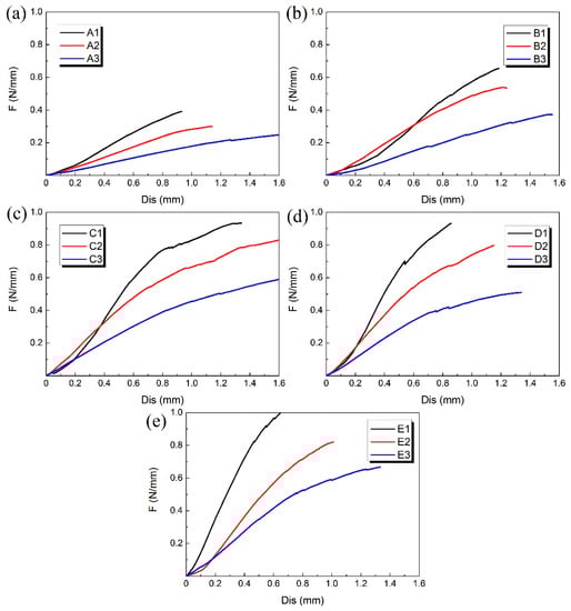 Radial force (per unit length) versus radial displacement curves for different groups of 3D-printed PLA vascular stents: from (a–e) are A, B, C, D and E group respectively.