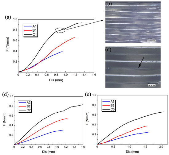 A, B and C three groups of 3D-printed PLA vascular stents had the same geometric parameters of arrowhead NPR structure, but different wall thicknesses. Compared the PLA stents with the same stent diameter in the three groups of A, B and C to study the effect of different wall thickness on the radial compressive property of PLA stent. The radial force versus radial displacement curves for different wall thickness are shown in Figure 8a,d,e. In the case of small deformation, the effect of the wall thickness on the radial force of the stent was not significant. Under the same compressive force, the difference of deformation between stents with different wall thicknesses was relatively small. However, with the increase of compressive force, the wall thickness showed a prominent role in compressive property. The difference of deformation between stents with different wall thicknesses became more and more notable.