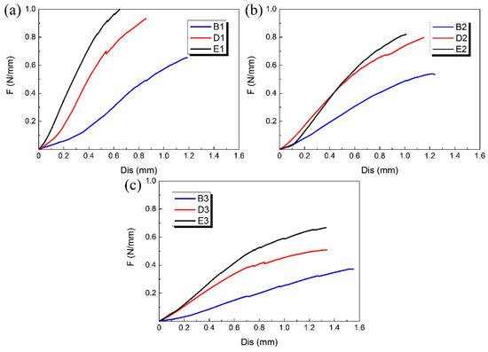 The B, D and E groups of 3D-printed PLA vascular stents had the same wall thickness, but different geometric parameters of arrowhead NPR structure. We compared the PLA stents with the same stent diameter in the three groups of B, D and E to study the effect of geometric parameters of arrowhead NPR structure on the radial compressive property of PLA stent. The radial force versus radial displacement curves for different wall thickness are shown in Figure 9a–c. The PLA stents in group E had the highest radial force, followed by D group and B group had the smallest. In condition of same stent diameter, the increase of angle φ and θ made the length L, m and h shorter, which led to the increase of surface coverage of the stent. Under the same compressive load, the stent with larger surface coverage had stronger compressive property and more material was deformed to resist deformation.