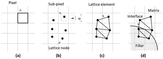 For the mesh generation, the microstructure of blended cement paste is represented by a pixel-based structure, as shown in Figure 1a. After the generation of a network of pixels, a sub-pixel can be defined with each pixel. A node is randomly placed in every sub-pixel of size s in a regular grid with size a, as shown in Figure 1b. The ratio s/a is defined as the randomness of a lattice. The reason for assigning certain randomness to the lattice mesh is to get rid of artificial periodic lattice effects and to describe the material more correctly. Here, randomness is set to be 0.5. To connect the nodes, lattice elements are generated using Delaunay triangulation, as shown in Figure 1c. The different types of beams are identified by material overlap procedures. Element properties depend on the two nodes assigned to an element. If the two element nodes are located within filler, the filler element can be identified. If one element node is located in the matrix and another element node located in hydration products, the element is called an interface element. In Figure 1d, the identification of different elements is presented. In this model, we generated a square specimen with an external size of 100 × 100 µm2 for a 2D lattice model.