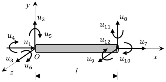 In the lattice approach, the cement paste blended with fillers is discretized as a set of lattice beam elements. A lattice beam element is a straight bar of uniform cross-section and can transmit axial forces, shear forces, bending moments and torsional moments. The lattice beam element has two nodes, and each node has six degrees of freedom including three translational and three rotational degrees of freedom, as shown in Figure 2. The displacement ue of the nodes of the beam in the local domain is: