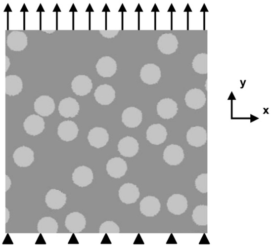 The concentration of the filler particles in a localized region may have an effect on the strength of cement paste. In this section, five different distributions of filler particles are considered and divided into two groups, as shown in Figure 4. The left column in Figure 4 represents the group with a strong interface (SI); the right column is that with a weak interface (WI). The filler particles in the specimen of Figure 4a,b are uniformly distributed. The filler particles in the rest of the specimens are randomly distributed. The diameter of filler particles is 10 µm. The filler area fraction is 25%.