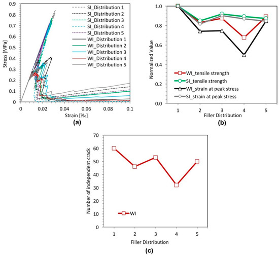 Figure 5a,b plots the stress-strain relations and variation of the strength and the strain at peak stress for different filler particle distributions with a strong interface (SI) and a weak interface (WI). From these graphs, it can be inferred that the strength of specimens with a weak interface (WI) is always much lower compared to that of specimens with a strong interface (SI). The specimens with the uniformly-distributed filler particles have the highest strength because stresses are uniformly distributed across the cross-section of these specimens. However, in practice, it is impossible to achieve such a uniform distribution. For the specimens with randomly-distributed filler particles, the influence of the filler distribution on the strength of the specimens with a strong interface (SI) is much smaller compared with that with the weak interface (WI). With different particle distributions, the specimens with a weak interface (WI) have a very different strength. The strength correlates with the number of independent cracks, as can be observed in Figure 5b,c. The specimen with a weak interface (WI) and filler particle Distribution 4 has the lowest strength and the least independent cracks, as shown in Figure 5b,c. This is due to the fact that many filler particles in this specimen are concentrated in a small region and very close to each other in the horizontal direction, as shown Figure 4h. This facilitates the connection of cracks and the final damage leading to lower strength; whereas, in the specimen (Figure 4b), all the initial cracks are spread out and developed because the filler particles are uniformly distributed. In this case, a higher stress is needed to reach the destruction point. For the specimen with a strong interface (SI), the initiation of cracks can be stopped due to high local cohesive strength. Therefore, only one main crack is developed.