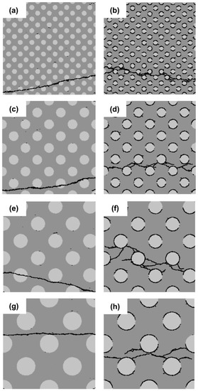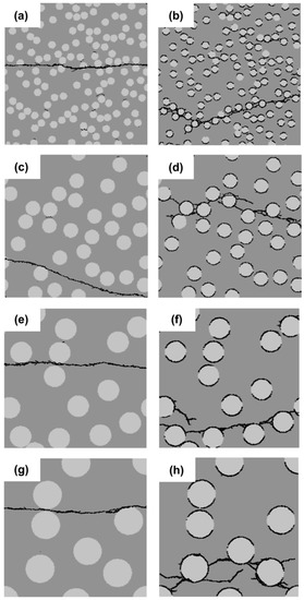 Micro-crack patterns of specimens with randomly-distributed filler particles for four different filler particle sizes (5 µm (a,b), 10 µm (c,d), 15 µm (e,f) and 20 µm (g,h)).