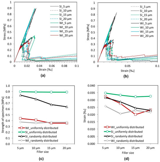 In addition, it can be seen in Figure 8a,b that the strength of specimens with a weak filler-matrix interface (WI) is always much lower compared to that of specimens with a strong interface (SI). This indicates that the effect of the particle size on the strength is much smaller than the effect of the interface strength on the strength of the cement paste specimen.