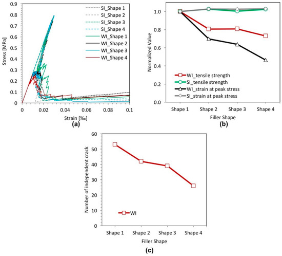 Simulated results of the filler shape effect analyses for specimens with a strong interface (SI) and a weak interface (WI). (a) Stress-strain relation; (b) variation of the strength and the strain at peak stress; (c) number of independent cracks.
