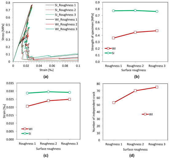 Figure 12 shows the stress-strain relations, the strength, the strain at peak stress and the number of independent cracks for different particle surface roughnesses. The figure shows that in the specimens with a strong filler-matrix interface (SI), the surface roughness of the filler particles has little effect on the strength and the strain at the peak stress of cement paste specimens. For the cement paste specimens with a weak filler-matrix interface (WI), the surface roughness of the filler particles has a significant influence on the mechanical response of the cement paste specimen. Figure 12b,c shows that the strength and strain at the peak stress of specimens increase with increasing surface roughness. This is possibly because that the rougher surface makes initial cracks harder to connect and to cause final damage.