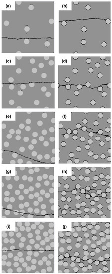Micro-crack patterns of specimens with uniformly-distributed filler particles and five different filler area fractions (5% (a,b); 15% (c,d); 25% (e,f); 35% (g,h) and 45% (i,j)).