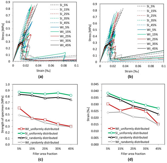 Although the filler content has a significant influence on the strength of specimens with a weak filler-matrix interface, the strength of specimens is always lower than that with a strong filler-matrix interface, as shown in Figure 15c. Even with a filler area fraction of 5%, the strength of the specimens with a weak interface (WI) is about 25% lower than that of the specimens with a filler area fraction of 45% with a strong interface (SI).