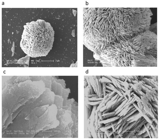 (a–d): SEM images of the vitamin B12 assisted synthesis of CuO nanostructures at different magnifications.