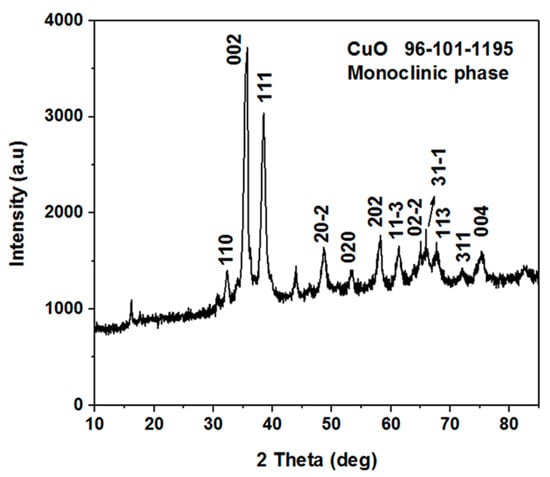 Figure 2 shows the XRD patterns of the nanostructured CuO material prepared using a low-temperature aqueous chemical growth method. The measured diffraction patterns are according to the standard (JCPDS card no: 96-101-1195). The CuO nanomaterial exhibited the monoclinic phase and no other peak was detected, which confirms the high purity of the CuO nanomaterial.