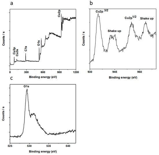 The chemical composition of the nanostructured CuO was further investigated using XPS measurements and the obtained spectra are shown in Figure 3. Figure 3a shows the wide scan survey for the elemental composition that has two distinctive peaks, where those at 284.00 and 531.00 eV represent C 1s and O 1s, respectively []. Additionally, the recorded peaks at 933.30, 121.10 and 77.00 eV could be attributed to Cu 2p, Cu 3s and Cu 3p respectively [].