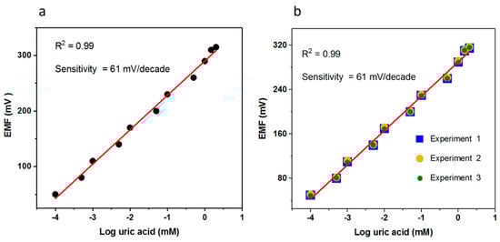 (a) The calibration fitting of the potentiometric uric acid biosensor for a concentration range of 0.0001–10 mM uric acid concentration; (b) the repeatability response of the uric acid biosensor in the concentration range of 0.0001–10 mM uric acid.
