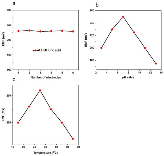 (a) The inter-electrode reproducibility of the uric acid biosensor in 0.1 mM uric acid; (b) the effect of pH on the output potential of the uric acid biosensor in 0.5 mM uric acid; (c) the effect of temperature on the potentiometric response of the uric acid biosensor in 0.5 mM uric acid.