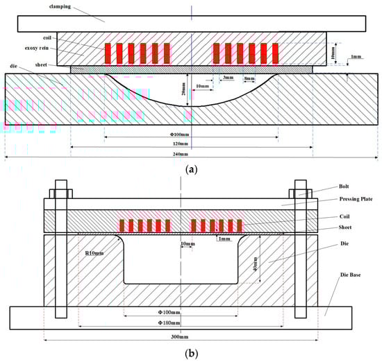Schematic of the experiment devices (a) high-speed impaction electromagnetic deformation using a hemispherical die and (b) using a cylindrical die.