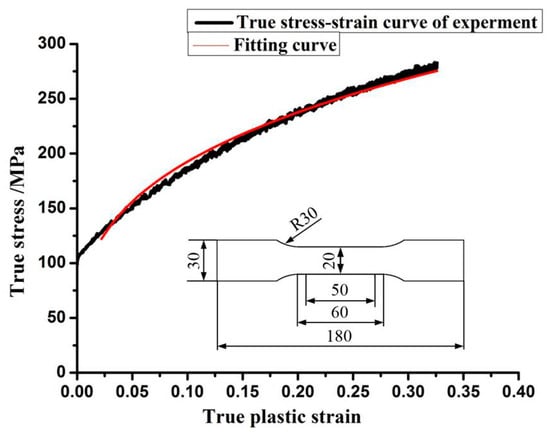 where is the dynamic flow stress, is the quasi-static constitutive behavior of the sheet (Equation (11)), is the plastic strain rate, and p and m are the C-S strain rate parameters. For aluminum alloy, p = 6500 s−1 and m = 0.25 are the specific parameters according to Liu et al. [,]. The Equation (11) is exponential model that can accurately describe a large plastic deformation for most metal materials (such as aluminum alloy, magnesium alloy, ferroalloy, and copper). The characteristics of strain hardening and the large plastic deformation during quasi-static forming can be expressed by this model. The elastic modulus (E) is assumed to be constant for the elastoplastic stage. The material volume is assumed to be incompressible during the plastic deformation, the poisson ratio is considered as a constant. By fitting the quasi-static constitutive model (Equation (11)), the model parameters k = 376.8 MPa and n = 0.3 can be obtained. The k and n are the strain hardening coefficient and hardening exponent, respectively. The fitted curve of the true stress vs. strain is highly consistent with the experimental data, when the plastic strain is ≥0.02 (Figure 2). The electromagnetic deformation is a large plastic deformation process, the effective plastic strain of 5052 aluminum alloy will reach 0.4. Thus, the parameters of the model can express the behavior of 5052 aluminum alloy (when the plastic strain ≥0.02)