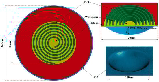 Figure 1 shows the schematic of the high-speed impaction electromagnetic deformation experiment, in which a hemispherical die and a cylindrical die were used. The high-speed impaction electromagnetic deformation using a hemispherical die is shown in Figure 1a. The 5052 aluminum alloy sheet was placed below a flat spiral coil, and then the coil was pressed by the hydraulic equipment to restrain the coil and sheet sliding. The dimensions of the coil and hemispherical die are also shown in Figure 1a. When the magnetic force reached the yield limit of the aluminum alloy sheet, the sheet was launched downwards. When the discharge energy reached a certain value, the sidewall and bottom area of the sheet would be impacted at high speed by the die. Meanwhile, high-speed impaction electromagnetic deformation using a cylindrical die was shown in Figure 1b. The cylindrical die cavity is a closed-round die, which has a diameter of 100 mm and an entry radius of 10 mm. The 180 mm diameter workpiece was placed below the coil. All high-speed impaction electromagnetic deformation experiments were conducted in the same manner. All the specimens formed in this study were printed on circular grids with a diameter of 2.5 mm. After the electromagnetic impaction deformation experiment, a circular grid would have an ellipse shape. A digital camera was used to capture the images of the selected grids. The corresponding major and minor strains were calculated from the deformed grids using an automatic grid analyzer software.