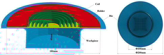 Finite element model of high-speed impaction electromagnetic deformation with a hemispherical die.
