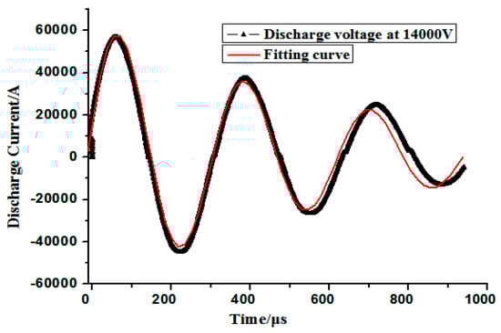 Numerical modeling was performed to investigate the deformation behavior and processes of electromagnetic high-speed impaction. The full coupling of impaction deformation of the electromagnetic field and the structure field was achieved by using finite element software LS-DYNA 9.0. The electromagnetic field in the conductor was analyzed by the finite element method (FEM), whereas the boundary element method (BEM) is used to solve the electromagnetic field of the air. The shell elements of the BEM are generated by the surface of finite elements. The established numerical model consists of a holder, a coil, a workpiece, and a die. All the parts were meshed into eight-node hexahedral elements, and the workpiece was meshed with a higher mesh density to improve the accuracy of the numerical model. The five-layer griddings were distributed along the sheet thickness direction. Coils were meshed with an element size of 0.5 mm in the cross section. The finite element model of high-speed impaction electromagnetic deformation with a hemispherical die was shown in Figure 3. The hemispherical die, coil, and blank holder were set to a rigid body. The holder and the die were considered fixed, and contact conditions were considered between the die and the sheet and between the sheet and the holder. Surface-to-surface contact was defined using the penalty method with a static friction coefficient of 0.2 and a dynamic friction coefficient of 0.1 []. The finite element model of electromagnetic high speed impaction with a cylindrical die was shown in Figure 4. The boundary conditions and the friction coefficient are the same as those in Figure 3. The coil structure and the geometric size are the same in the two finite element models. Figure 5 shows the discharged current measured in the experiment at a discharge voltage of 14 kV. The experiment data were fitted for the electromagnetic high-speed impaction, and approximately one cycle of the current of roughly 290 μs was inputted as coil excitation in the numerical simulation. The parameters of 5052 aluminum alloys were shown in Table 2. The current loads were applied to the finite element model. The plastic deformation and fracture behavior of the 5052 aluminum alloy sheet on the hemispherical and the cylindrical dies will be predicted.
