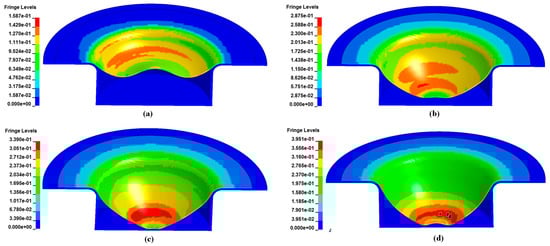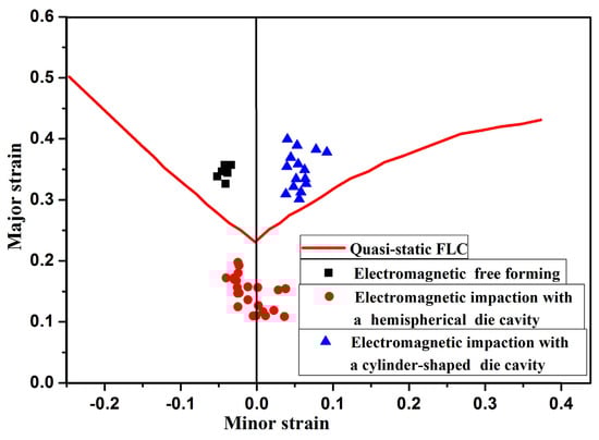 Figure 6 shows the formability of 5052 aluminum alloy that was measured experimentally in electromagnetic free forming and electromagnetic impaction deformation with different dies. A formability increase of 24.11% compared with the quasi-static forming conditions was observed in electromagnetic free forming. In high-speed impaction electromagnetic deformation with a cylindrical die, a rebound occurred in the center region of the workpiece, and the strain state was biaxial stretching. A formability increase of 26.67% compared with the quasi-static forming conditions was also observed. However, in electromagnetic impaction with a hemispherical die, a formability decrease of 25% was observed due to sheet-die impaction and serious rebound, which contradicts with the previous reports [,,] that the formability of materials will be increased during high-speed impaction die forming. Therefore, an examination of the forming process in terms of strain rate, impaction pressure stress, and stress state was performed using finite element simulation to provide a reasonable explanation for the unexpected phenomenon that occurred in electromagnetic impaction deformation with a hemispherical die. On this basis, the influence of die geometry on the forming limits of 5052 aluminum alloy in electromagnetic forming is finally discussed.