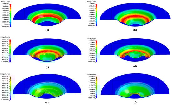 Figure 8 shows the shape variation and major strain via numerical simulation of electromagnetic impaction with the hemispherical die. In the initial deformation stage, the specimen periphery region impacted with the sidewall of the hemispherical die under the driving force of electromagnetic repulsion. Given the restraint of the hemispherical die, the specimen periphery region was extruded upward when the center region of the specimen moved at a high speed toward the bottom of the die (Figure 8c). When the center region of the specimen impacted with the bottom of the die, the center region suffered a serious rebound. Under the action of the electromagnetic force, the sidewall region of the sheet gradually moved downward again (Figure 8d). The center region of the specimen changed from concave downward to upward convex when it impacted with the bottom of the die, and the specimen center region changed from extruding to stretching. Finally, a crack appeared in the apex region of the specimen under high-speed rebound.