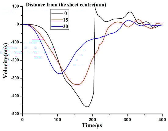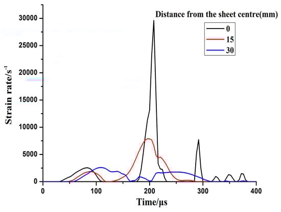 Figure 9 shows the velocity variation of electromagnetic impaction deformation with the cylindrical die. The downward maximum velocity of the center point reached 460 m/s. The sheet impacted with the bottom of the cylindrical die at high speed, and a serious upward rebound occurred at the center. However, the upward velocity of the center region increased slightly at close to 290 μs because the rebounding speed continued to increase under the action of inertia. A remarkable increase occurred in the strain rate when the sheet impacted with the cylindrical die as shown in Figure 10. The maximum strain rate was approximately 30,000 s−1 when the sheet impacted with the bottom of the cylindrical die at high speed.