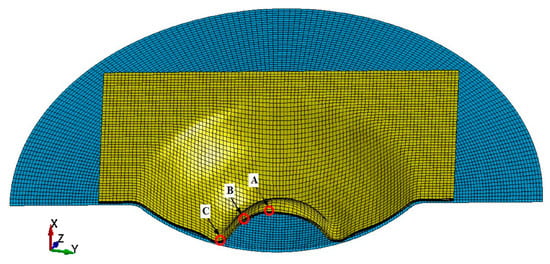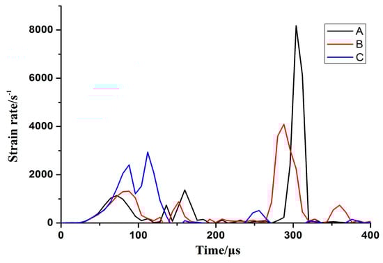 Figure 11 shows the several positions of interest located along the radial direction of the sheet that impacted with the hemispherical die. Element A was located at the center of the sheet, element B was 15 mm away from the center, and element C was 30 mm away from the center. Figure 12 shows the evolution of the effective strain rate when the sheet impacted with the hemispherical die. The maximum effective strain rate was less than 3000 s−1 when the sheet impacted with the sidewall and the bottom of the hemispherical die. However, the maximum strain rate of element A was more than 8000 s−1 when electromagnetic discharging was completed during the inertia stage. Therefore, the strain rate was different for sheet high-speed impaction with different die geometries at the same discharge energy. The value of strain rate with the cylindrical die was almost four times higher than that with the hemispherical die.