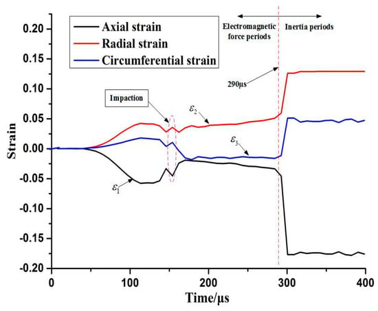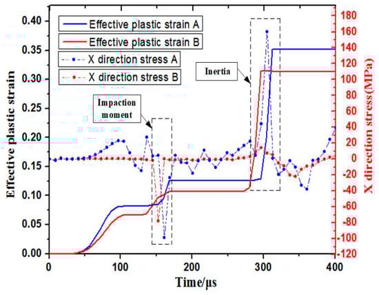 Figure 13 shows the time–strain curve of the center region when it impacted with the hemispherical die. The , and denote the axial strain, radial strain, and circumferential strain of element A, respectively. Plastic strain increased slightly when the center region of the sheet impacted with the bottom of the hemispherical die at high speed at a time of 160 μs. The circumferential strain of element A changed from positive to negative after the impact. This result indicated that the center region suffered from circumferential extrusion via the sidewall deformation. The squeezing effect was gradually enhanced, particularly by the upward rebound in the center region. However, when electromagnetic discharging was completed during the inertial periods, the absolute value of axial strain increased significantly after 290 μs compared with the impaction process. Therefore, plastic deformation mainly occurred during the inertial periods after electromagnetic discharging was completed rather than during impaction between the sheet and the hemispherical die. The center region of the sheet was initially subjected to severe circumferential extrusion and then suffered from upward rebound tensile stress under inertial action during the impaction process. Consequently, the combination effect of upward “extrusion-stretching” resulted in the fracture of the sheet’s center region. Figure 14 shows the effective plastic strain and axial stress distribution of element A and B over time. When the sheet impacted with the surface of the hemispherical die at high speed, the effective plastic strain did not increase significantly. By contrast, the plastic strain increased rapidly when electromagnetic discharging completed. Element A was subjected to the interaction between tensile stress and compressive stress before impaction. When element A of the sheet impacted with the bottom of the hemispherical die at high speed, the center of the sheet was subjected to impaction stress (approximately 100 MPa). However, when electromagnetic discharging was completed, the sheet’s center region suffered from considerable tensile stress due to the inertia effect.