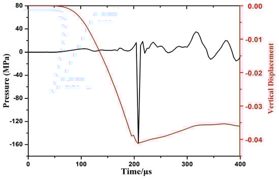 Displacement and pressure of the center region of the sheet while impacting with the cylindrical die.