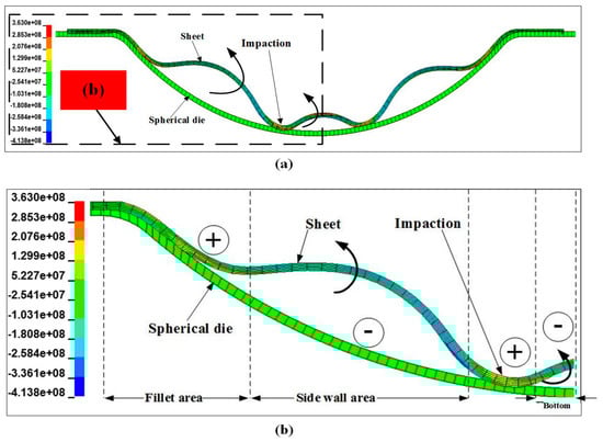 The radial stress state of the sheet is highly complicated during a continuous impaction process. Figure 16a shows the entire contour distribution of the radial stress when the sheet impacted with the hemispherical die. To analyze the stress state in detail, half of the contour is shown in Figure 16b. The sheet was divided into four sections, namely, the fillet region, sidewall region, impaction region, and bottom. The fillet region suffered from tensile stress, whereas the sidewall region of the specimen mainly suffered from compressive stress. An upward extrusion deformation occurred at the sidewall area, and the impaction region suffered from tensile stress at the radial direction. However, the bottom of the specimen was subjected to serious radial compression (over 300 MPa) because further downward deformation was restricted. The improvement of plastic deformation will be inhibited.