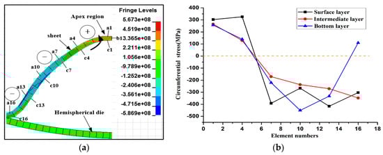 Figure 17 shows the contours of the circumferential stress before the sheet’s center region was fractured. The specific elements within the impaction rebound zone were analyzed. The sheet was divided into five layers in the thickness direction. To better analyze the stress state, the surface, intermediate, and bottom layers were selected for analysis. The labels a, b, and c represent the surface, intermediate, and bottom layers, respectively. The element numbers were 1, 4, 7, 10, 13, and 16 from sheet’s center to the sidewall. The circumferential stress was basically negative along the radius direction except for the sheet’s center region, thereby indicating that the sheet’s sidewall suffered from compression throughout the circumferential direction, and only the apex region elements of the sheet exhibited bidirectional tensile stress. Figure 17b shows the circumferential stress distribution of the elements in the different layer illustrated in Figure 17a. The stress state of the same radius at different layers was nearly identical except for element c16. The surface layer element a16 and intermediate layer element b16 were under compression stress, and the bottom layer suffered from tensile stress for element c16 due to upward bending after impacting with the die. Elements 1 to 4 of the sheet’s center region suffered from the tensile stress at all the layers. By contrast, elements of the other sidewall region were mainly subjected to extrusion stress at the circumferential direction. Consequently, the apex region suffered from tensile stress and simultaneously, the sidewall region was subjected to large inward extrusion stress, thereby causing fracture in the center region at an early stage.