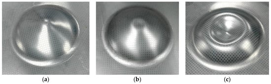 Formed specimens of electromagnetic impaction deformation with the hemispherical die under different discharge energy values: (a) 6.8 kJ, (b) 8.6 kJ, and (c) 15.3 kJ.