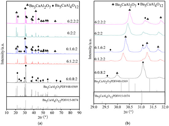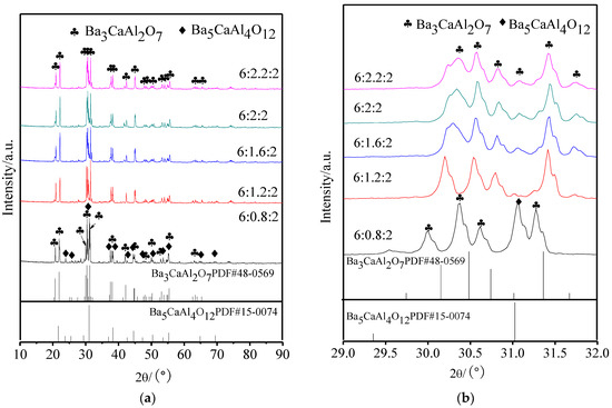 Figure 1 displays the XRD patterns of aluminates with different molar amounts of CaO; Figure 1b is a partial enlarged drawing of 2θ in the range of 29° to 32°. It could be seen from Figure 1a that the aluminate phase was a mixture of Ba3CaAl2O7 and Ba5CaAl4O12 when the molar amount of CaO was 0.8, and when the molar amount of CaO was more than 1.2, only a single Ba3CaAl2O7 phase was seen. From Figure 1b, it could be determined that, with the increase of the molar amount of CaO, the diffraction peak of Ba3CaAl2O7 at 30–31° became wider and shifts to a higher angle.